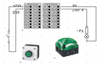 When installing a push button that for instance could be used to start the program, connect the button as shown in the picture. Mount a wire in the +24V terminal in the digital input block, connect it to the contact element in the push button. Connect a wire to the other side of the contact element going back to the DI0 terminal.