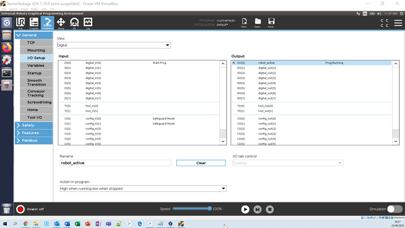In the I/O Setup tab that is shown in the picture it has been named “robot_active” and been given the action “High when running-low when stopped”. This means when the robot is in operation there will be +24V on the digital output and the light will be on.