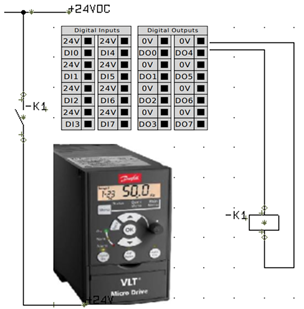 The picture below shows one way of doing that. The relay is controlled by the digital output DO4 and the signal in this case to a frequency converter is taken directly from an external power supply and controlled with a NO contact element in the K1 relay.