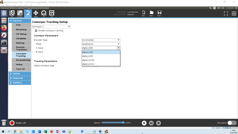 You can use the dedicated horizontal digital input block DI8-DI11 to connect a total of two encoders, they are placed on the left-hand side on the overview picture above. The inputs are only visible in the menu: Go to: Installation → General → Conveyor Tracking.