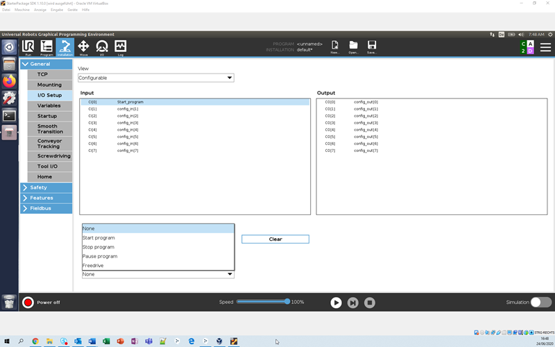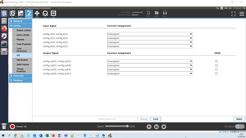 As shown in the first picture, go to: Installation → Safety → I/O and set the function assignment to “Unassigned”. You will now be able to use the configurable I/O as general purpose I/O. For example, you can assign one of the build-in actions in the I/O setup menu.
