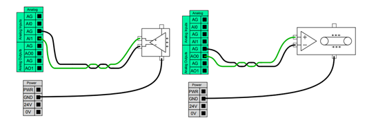 The examples show how to connect an analog sensor to the analog input (AI1) and a conveyor belt with analog speed control input to the analog output (AO0).