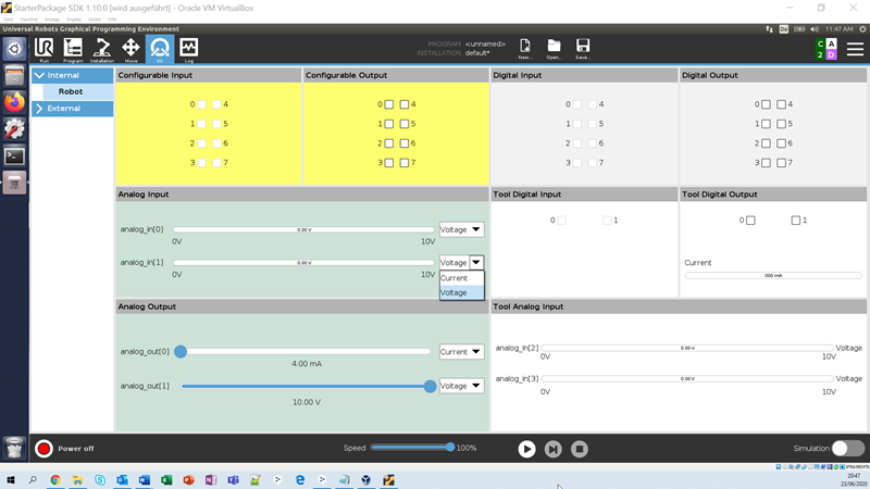 There are 4 analog inputs and 2 analog outputs available, 2 of the inputs are located at the tool flange. Analog inputs are often used to receive a variable signal, this could for instance be a pressure transducer which returns a signal from 4-20mA in the scale of 0 to 100 bar. It is preferable to use the current signal [mA], since it is less sensitive to interferences. There is also an option to receive and send a voltage signal in the range of 0-10V.