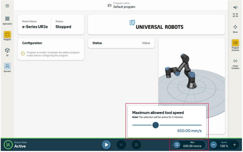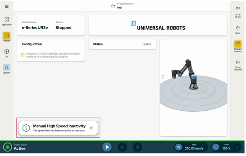 Note: The Manual High Speed footer component will not be shown if the Tool Speed limit (under Robot Limits) in the Safety Configuration is set to 250 mm/s or lower.