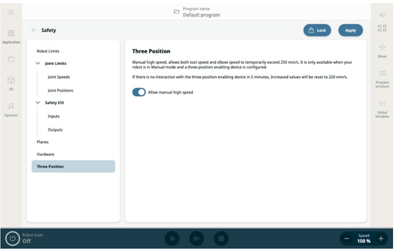 The Manual High Speed functionality can be enabled/disabled in the Safety Configuration in the new Three Position section.