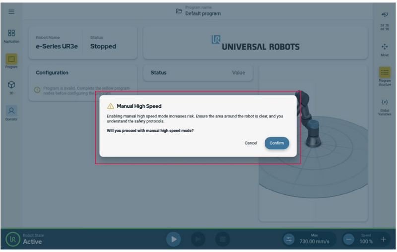 A popup with a safety warning is displayed, the first time the Manual High Speed footer component is pressed (to access the popup with the slider) after the robot has entered Manual Mode.