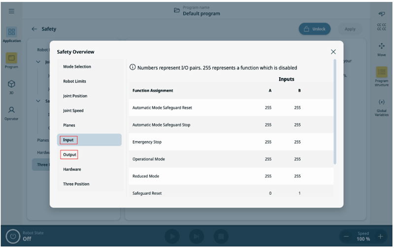 In the Safety Overview dialog, the I/O section has been split into an Input and an Output section.