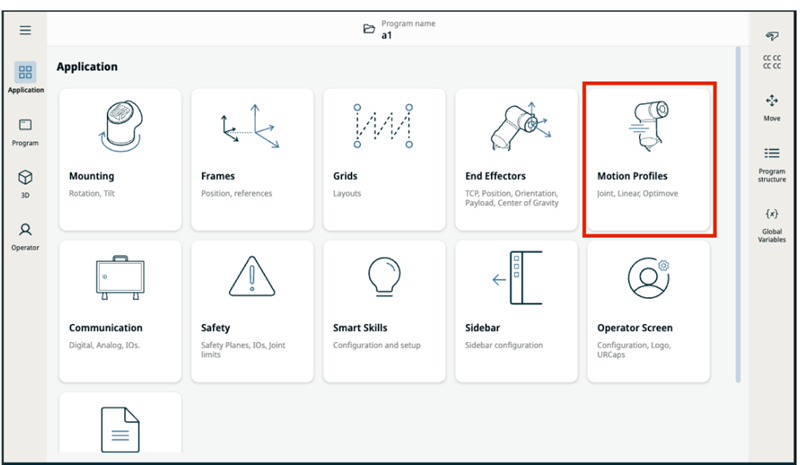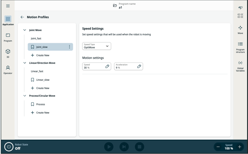Defining Motion Profiles is a new tool that allows you to share movement parameters across your program. You can define the speed and acceleration combination under a single profile name, for example 'Fast', 'Slow', 'Inside_CNC', 'Welding'. You can then reference this profile name in any new move node in your program, even if the moves are not grouped in a folder.