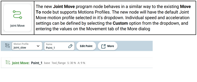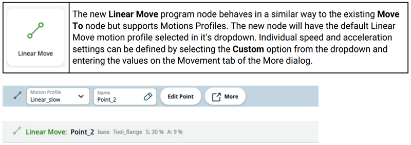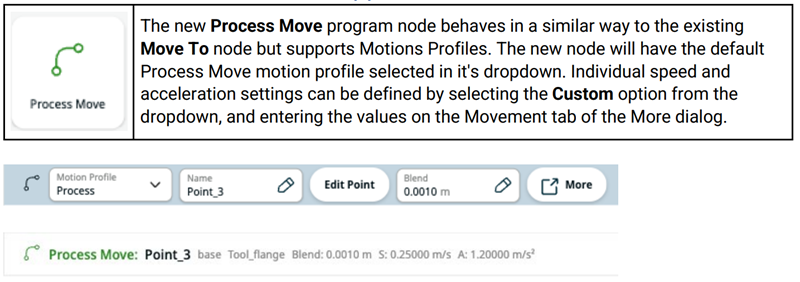 There are three new move nodes, corresponding to the move types: Joint, Linear, and Process. These nodes utilize the new motion profiles. The existing Move To node is unaffected by these new nodes. It is recommended that new programs use the new motion profile enabled nodes instead of the Move To, as future movement related features will only be added to the new nodes.