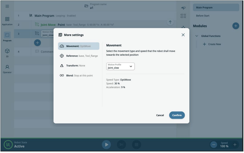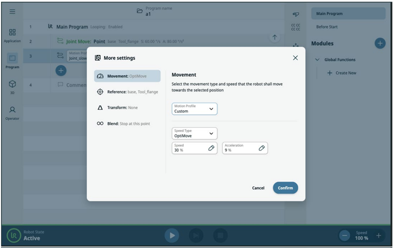 For each profile a Speed and Acceleration can be set. For the Joint and Linear profiles, these values can be set using the new OptiMove functionality. This allows the values to be set as a percentage of their maximum allowed. It is the recommended option for program safety and reliability, as well as robot longevity. Alternatively, Classic speed type can be selected for specifying values in m/s and m/s².