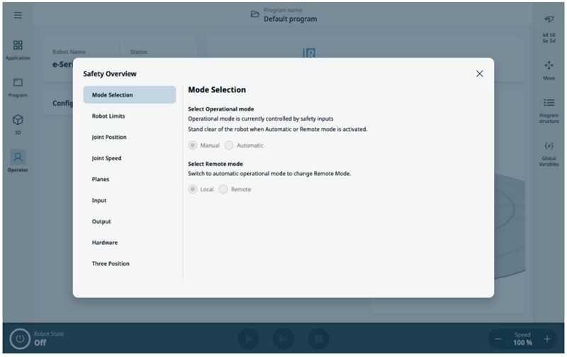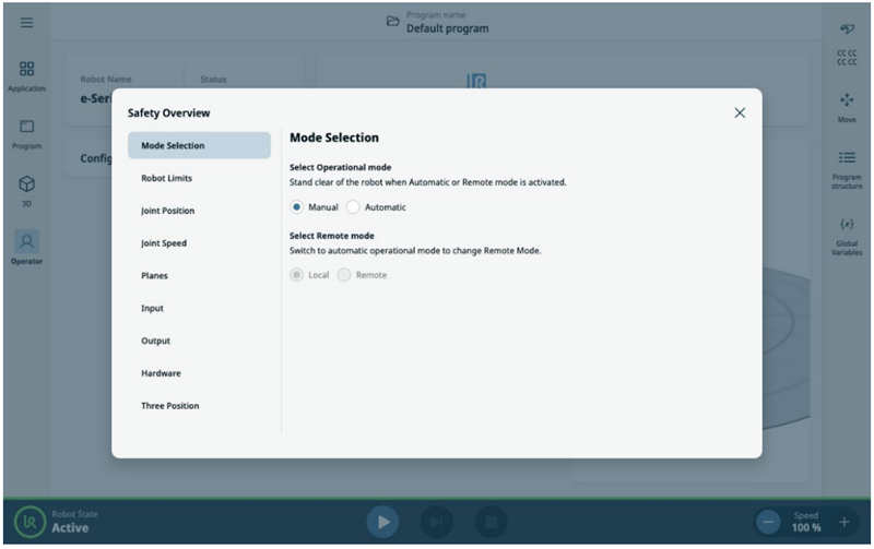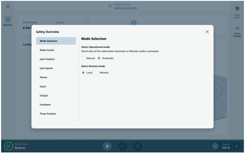We’ve introduced a new Remote Mode feature in the Safety Overview dialog of PolyScope X, designed to enhance external connectivity while maintaining a secure and operator-friendly interface.