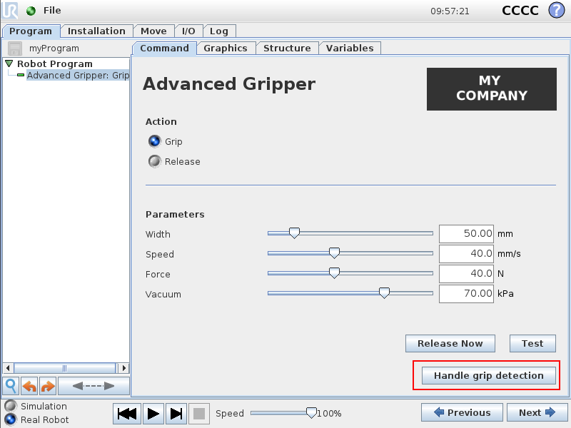 - Fixed issue where pressing the Test or Grip Now/Release Now buttons in the Gripper program node could result in a runtime exception. This would occur, if the corresponding script code for the preamble, grip or release actions (the result of calls to the 'generatePreambleScript(ScriptWriter)', generateGripActionScript(ScriptWriter)'' and 'generateReleaseActionScript(ScriptWriter)' methods) generated by a gripper contribution made use of conditional statements, such if- and while-statements.