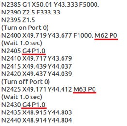 - G01 X100 Y100 M62 P0 -> Set Port 0 high