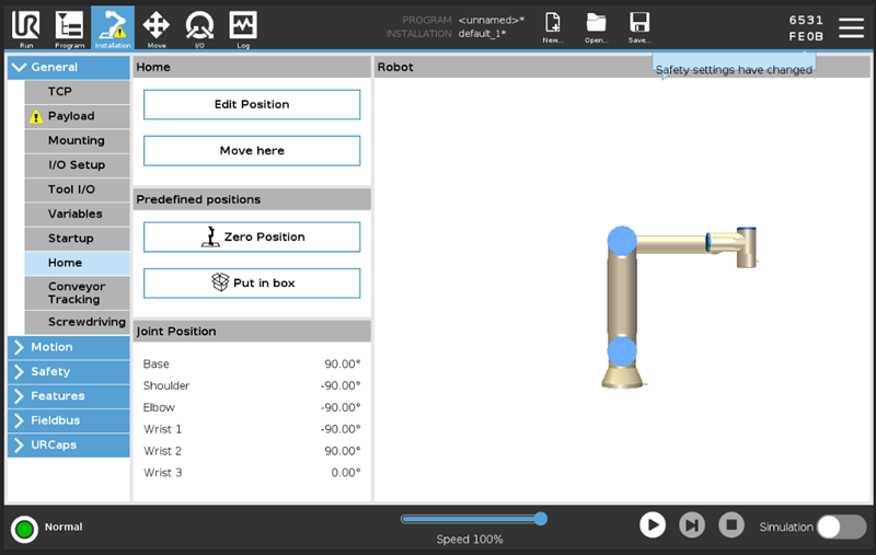 new predefined position has been added to the Installation → Home page under a new Predefined positions section, replacing the previous Put in Box program available on some robots.